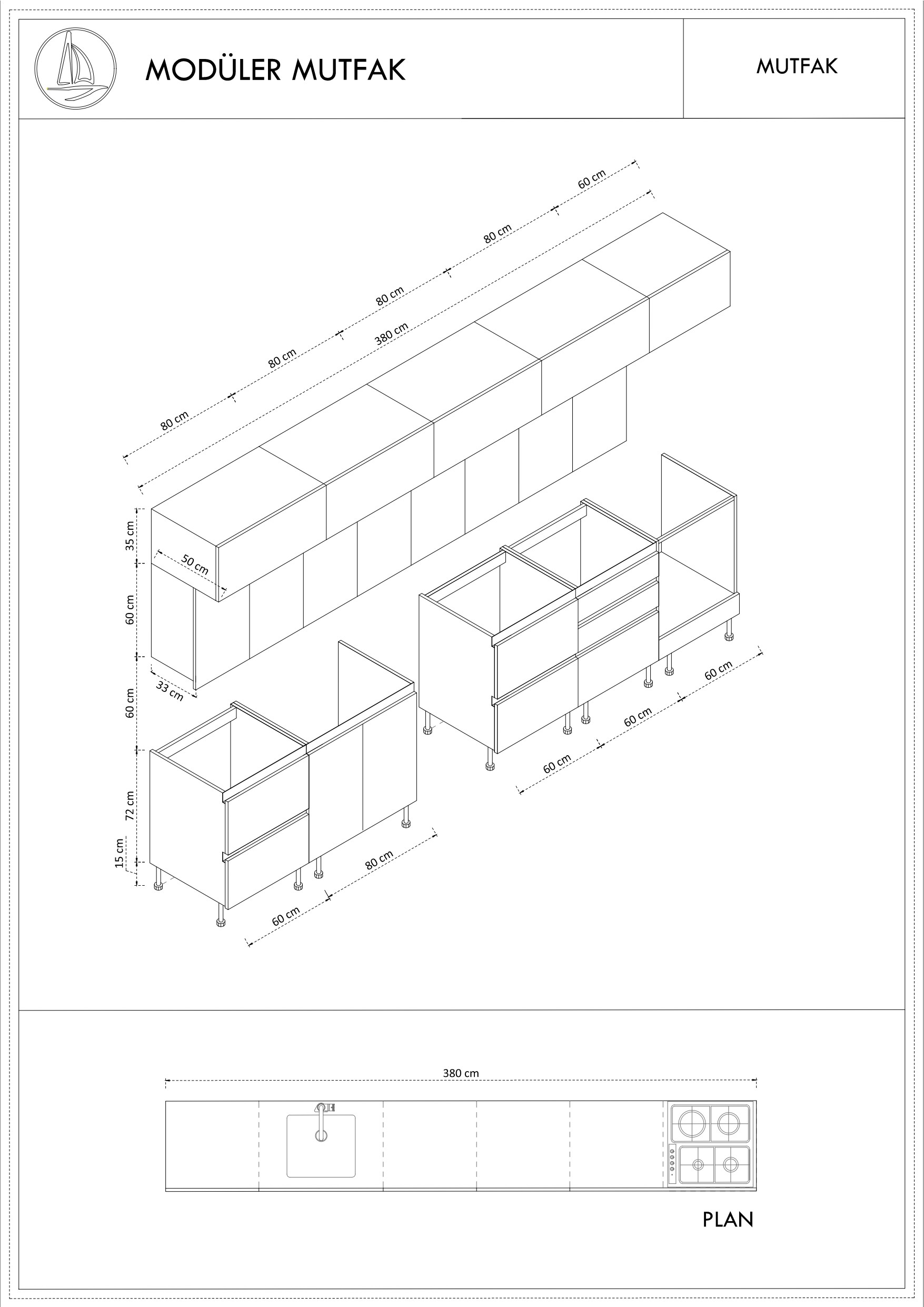 Mutfağınıza şıklık ve işlevsellik katmak için 380cm – Model045 – Hazır Mutfak Dolabı.